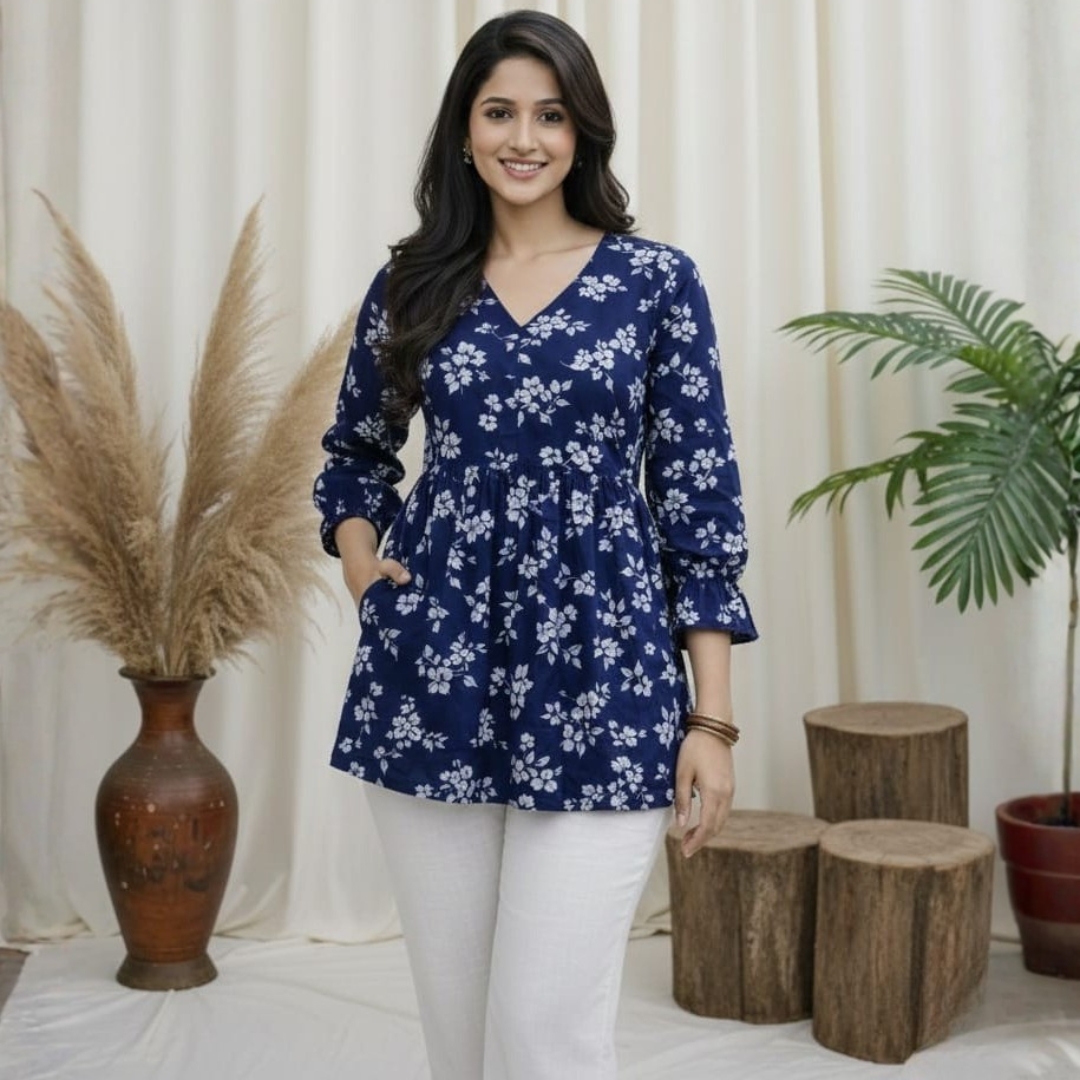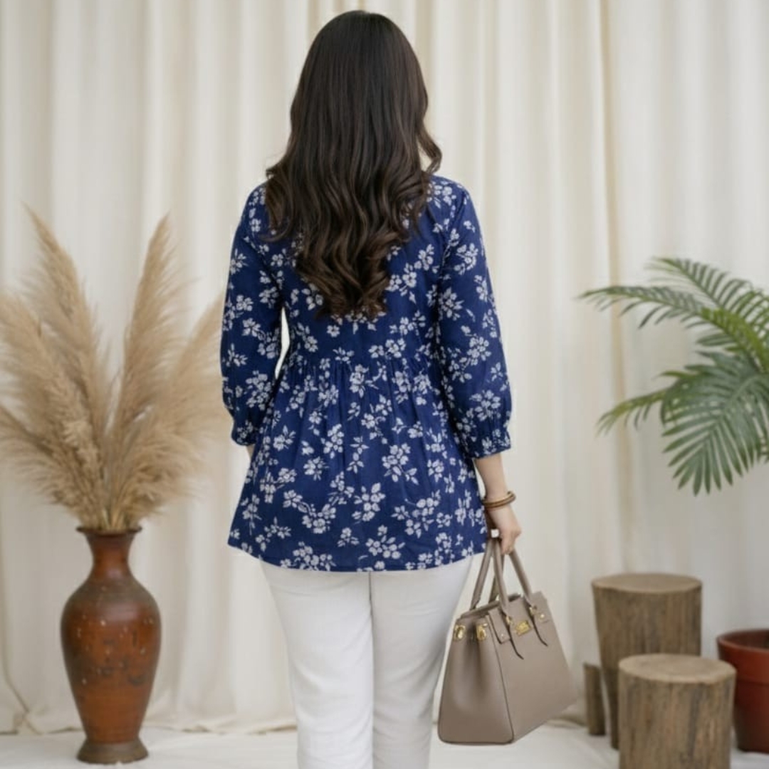The design features a flattering V-neckline that enhances the neckline naturally, while the gently gathered waist creates a flowy, comfortable fit. Delicate floral prints spread across the indigo base add a fresh and timeless appeal, making the top versatile and easy to style. Full-length sleeves with a relaxed finish add to its everyday practicality.