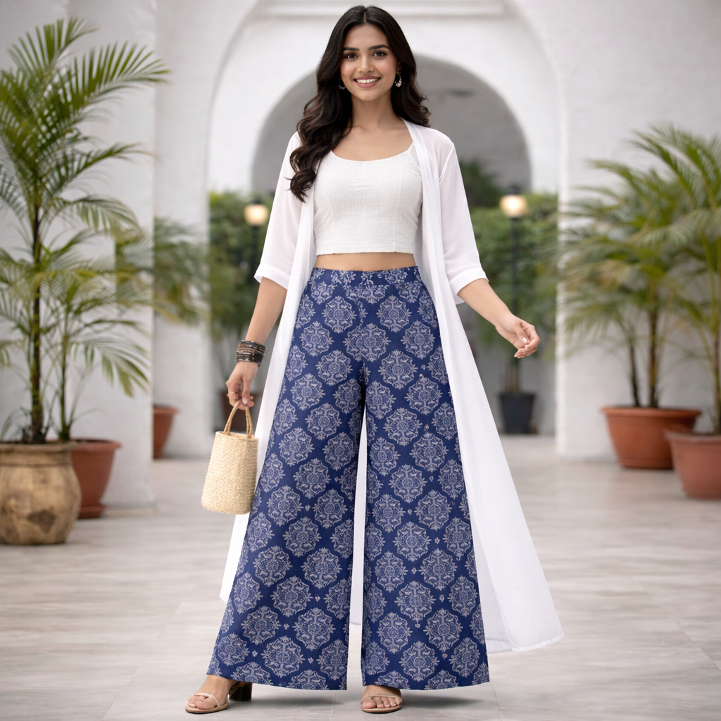The Indigo Bloom Cotton Palazzo Set is a perfect blend of softness, structure, and modern charm. Designed for women who enjoy relaxed silhouettes with refined detailing, this ensemble features a minimalist ivory crop top layered with a sheer, flowy open cape that adds lightness and movement.