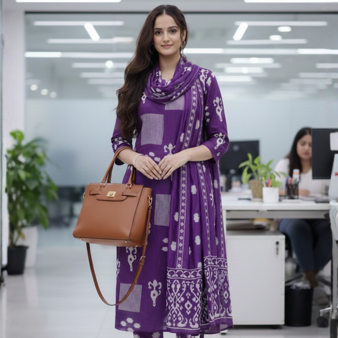 Niyara – Purple Ikat Office Set is thoughtfully crafted for modern women who prefer effortless elegance in their everyday workwear. Made in a rich purple ikat fabric, this set brings together traditional aesthetics with a clean, contemporary silhouette suitable for office environments.