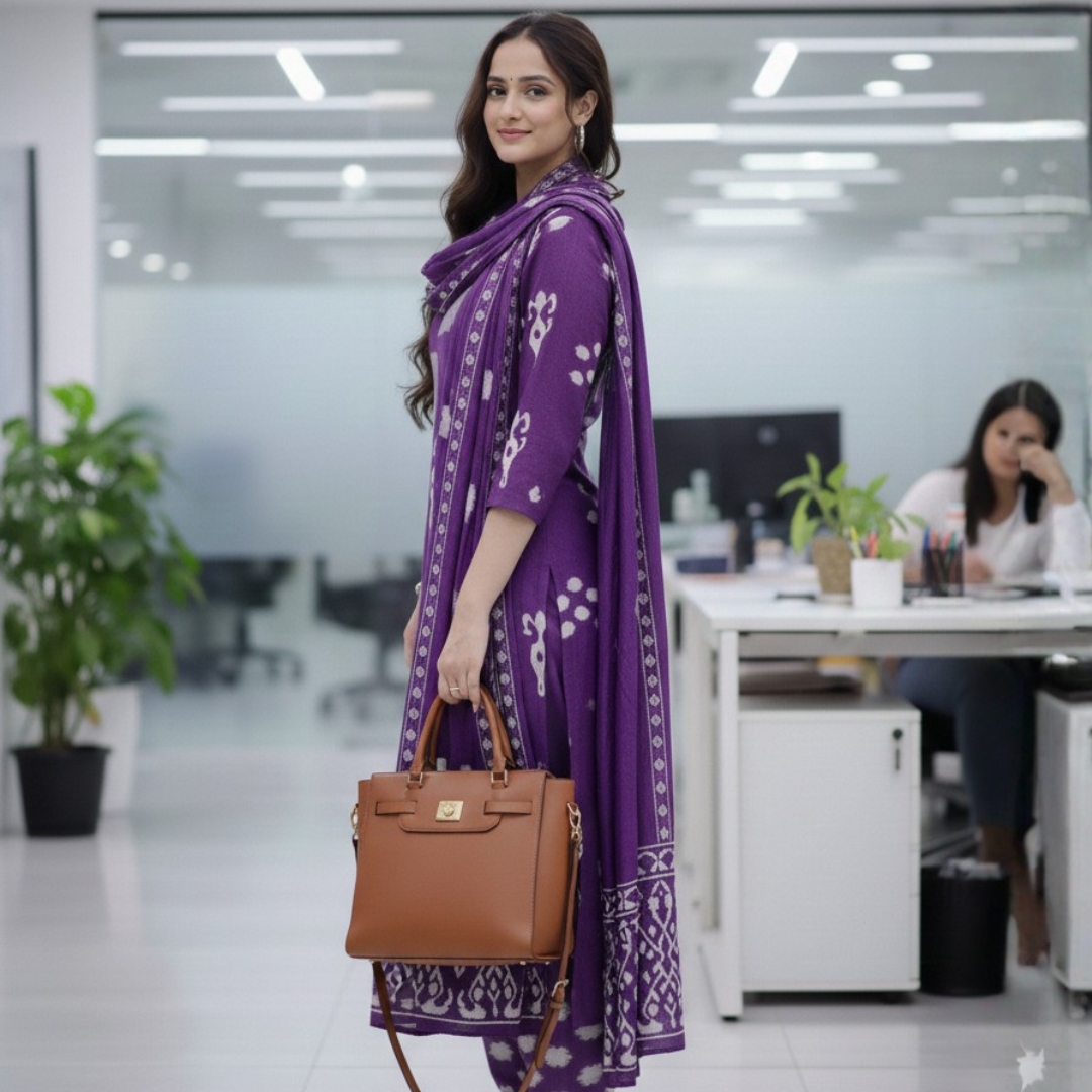 Niyara – Purple Ikat Office Set is perfect for women who appreciate subtle detailing, timeless design, and versatile styling that transitions seamlessly from work to after-hours engagements.