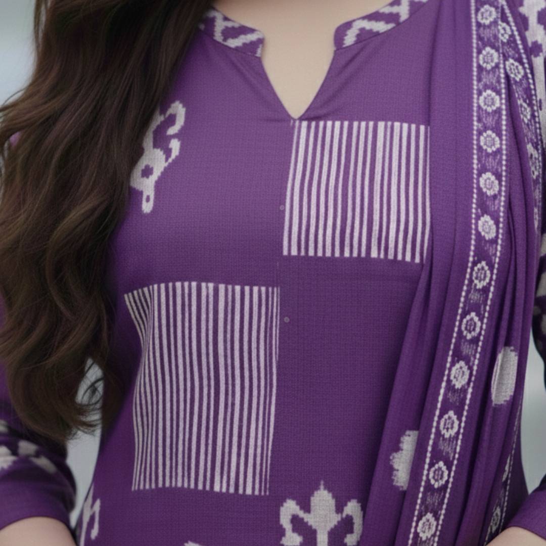 Niyara – Purple Ikat Office Set is a graceful blend of comfort and elegance. Designed for everyday workwear, this ikat kurta set features a clean neckline, coordinated dupatta, and a refined silhouette perfect for office wear and formal outings.
