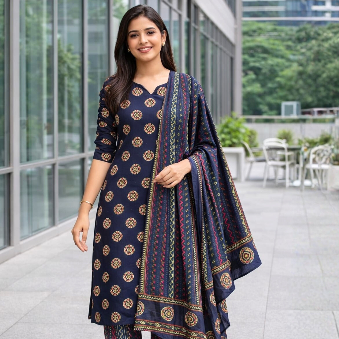 The rich midnight blue base with intricate ethnic motifs gives this outfit a classy and versatile appeal. Paired with matching printed pants and a beautifully coordinated dupatta, the set creates a complete look that is perfect for office wear, casual outings, festive gatherings, or everyday elegance.