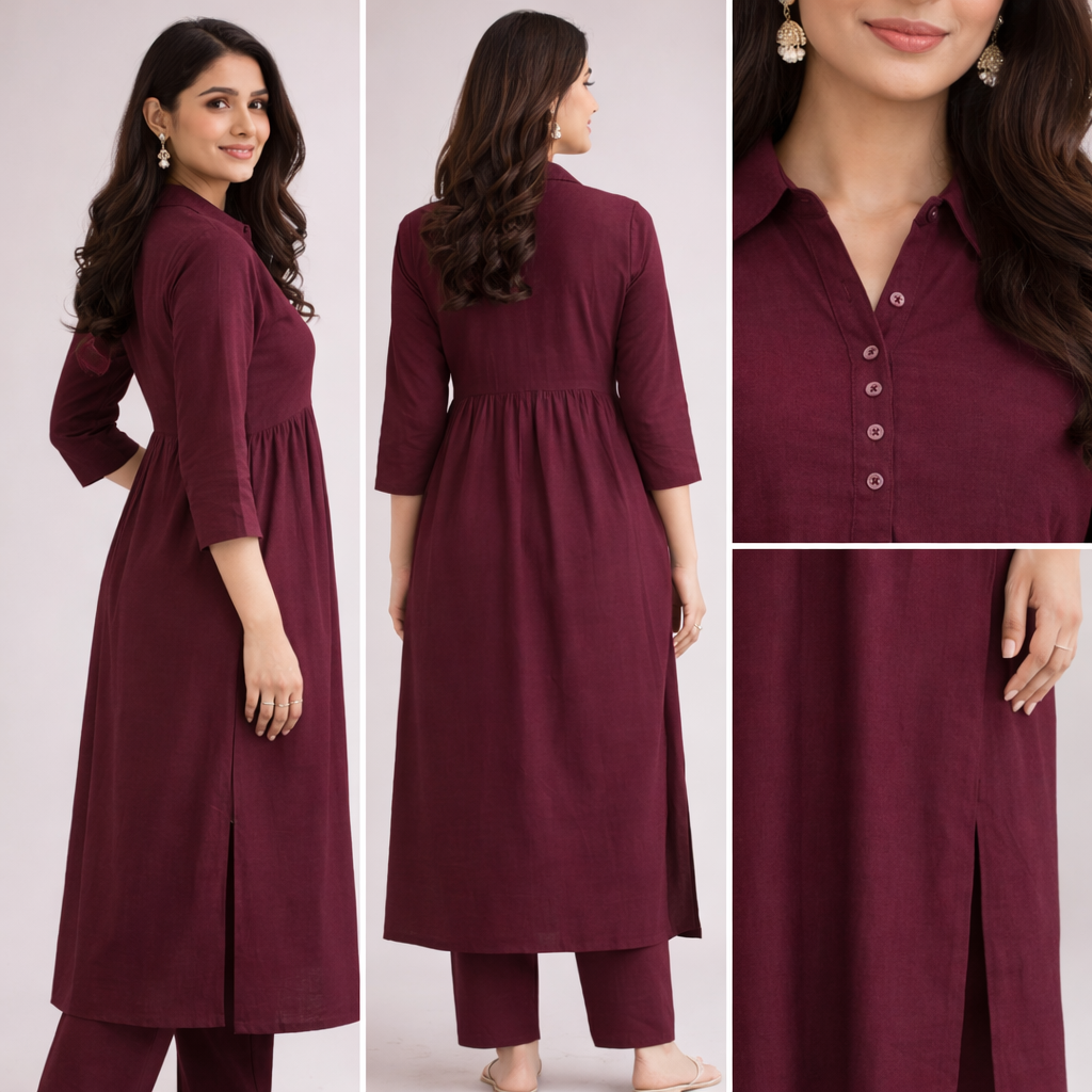 This Wine Cotton Gathered Kurta Set is crafted for effortless everyday elegance. Made from soft, breathable cotton, the kurta features a classic buttoned neckline with a gentle gathered waist that offers a flattering, flowy fall without clinging to the body.